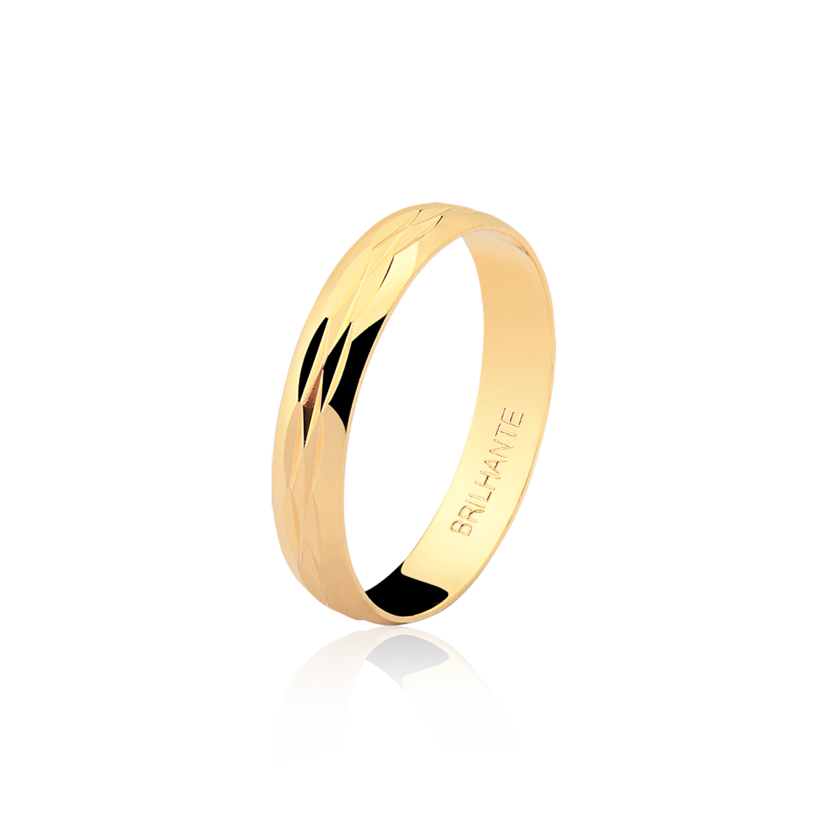 Feita com Ouro de alta pureza, a Aliança brilha intensamente, refletindo a luz de maneira encantadora. Seu acabamento polido garante um brilho duradouro, tornando-a uma peça de destaque em qualquer situação.