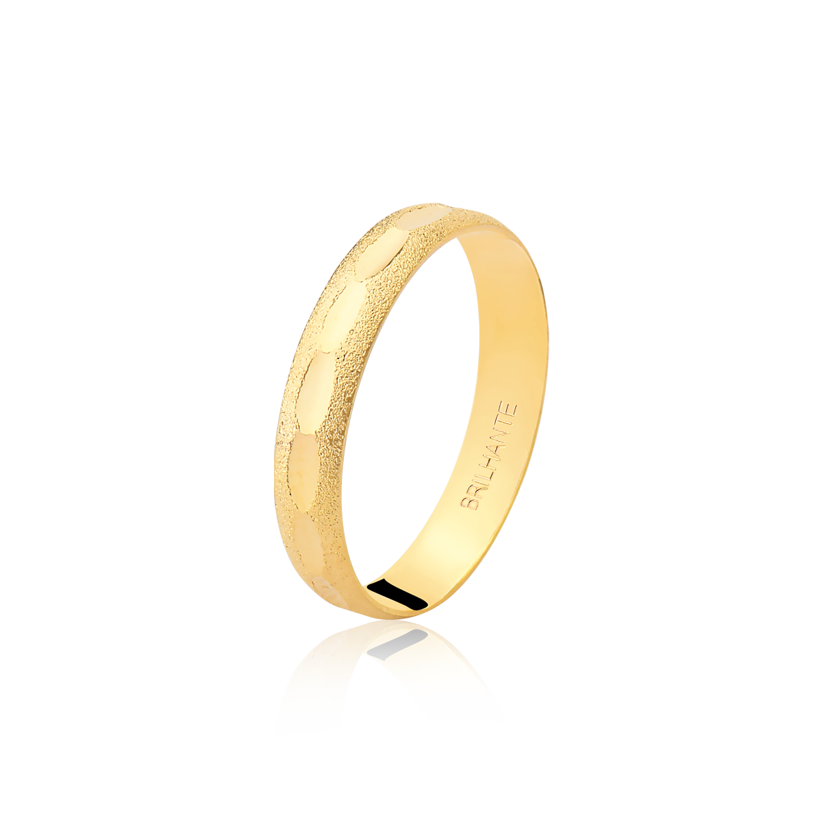 Feita com Ouro de alta pureza, a Aliança brilha intensamente, refletindo a luz de maneira encantadora. Seu acabamento polido garante um brilho duradouro, tornando-a uma peça de destaque em qualquer situação.